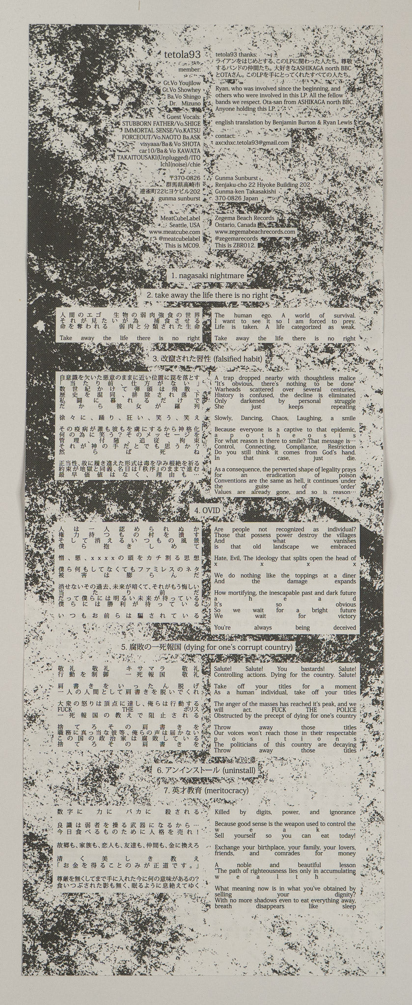 The final album from one of Japan's most intense and innovative bands is finally upon us! 14 tracks of despair, hope, passion and fury for fans of Killie, Louise Cyphre, and Envy. Breaking up in the middle of 2013, TETOLA93 tracked one final album that will stand as their legacy - and they recorded entirely by themselves. The album combines re-recordings of old favorites with new epic songs and a fully realized production that brings everything together. This is truly one of the most ground-breaking records to come out of Japan and a serious contender for album of the year. The LP comes on black vinyl with lyric insert & download card sealed in a printed envelope, all in a full-color jacket printed on recycled chipboard. This album is a co-production between Seattle's MeatCubeLabel and Canada's Zegema Beach Records.