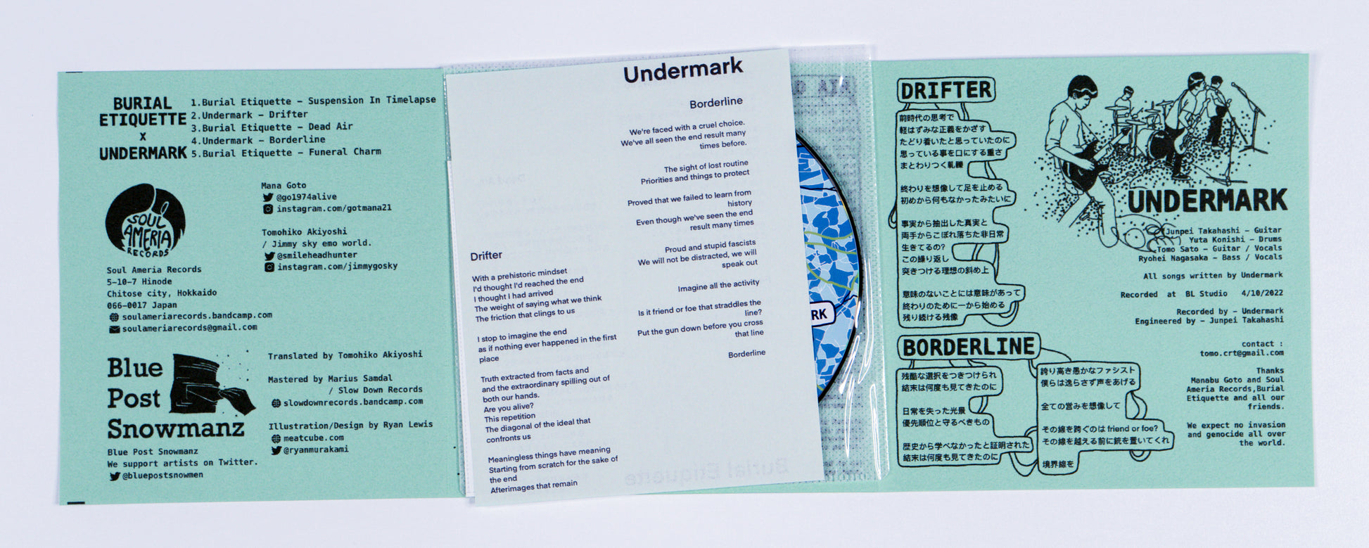 Undermark (From Nagoya) - Formed by Tomo Sato (vocals/guitar), who had been actively involved in bands such as The Sun, Sprint, Anma, Cuthbarts, End All, and Ro, with a focus on the Sapporo live house KLUB COUNTER ACTION. Inspired by Tomo's relocation from Sapporo to Nagoya, he joined forces with Junpei (guitar) and Ryohei (bass/vocals) from Crows Caw Loudly, as well as Yuta (drums) from by the end of summer, to form Undermark. Tomo has been influenced by intense 90s straight-edge band vibes and bands associated with Doghouse Records, Initial Records, and Ebullition Records, gradually steering towards an emotional musical style. He expressed that Undermark represents his desire to pursue his favorite music genuinely, acknowledging that it might be the last time he starts a band from scratch in his career.